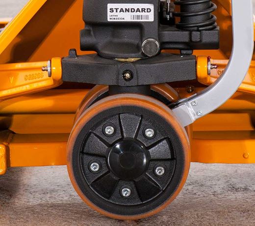 The Lift-Rite Power Start Assist pallet truck features Power-Start-Technology, which enables this unique hand truck to easily overcome initial inertia of a load, with a simple design that reduces strain on the operator without the use of batteries or motors. By simply pumping the towbar up or down, the operator can easily maneuver the Lift-Rite start assist manual pallet truck in any direction, even when carrying the maximum load.